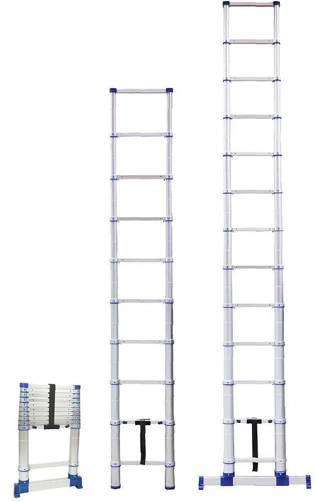 Die robuste Teleskopleiter ist einfach zu bedienen und hat Füsse aus rutschfestem Kunststoff.